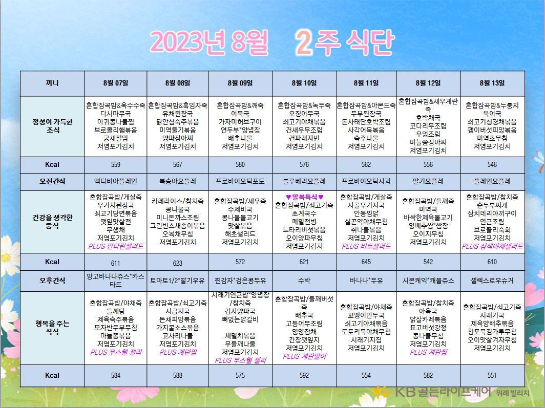 위례빌리지 [식단안내] 위례 빌리지 8월 2주차 식단표 페이지 정보 작성자 KB 골든라이프케어 댓글 0건 조회 2,372회 작성일 23-08-08 14:28 목록 본문 목록 이전글[식단안내] 위례케어센터 8월 2주차 식단표 23.08.08 다음글[식단안내] 서초 빌리지 8월 2주차 식단표 23.08.04