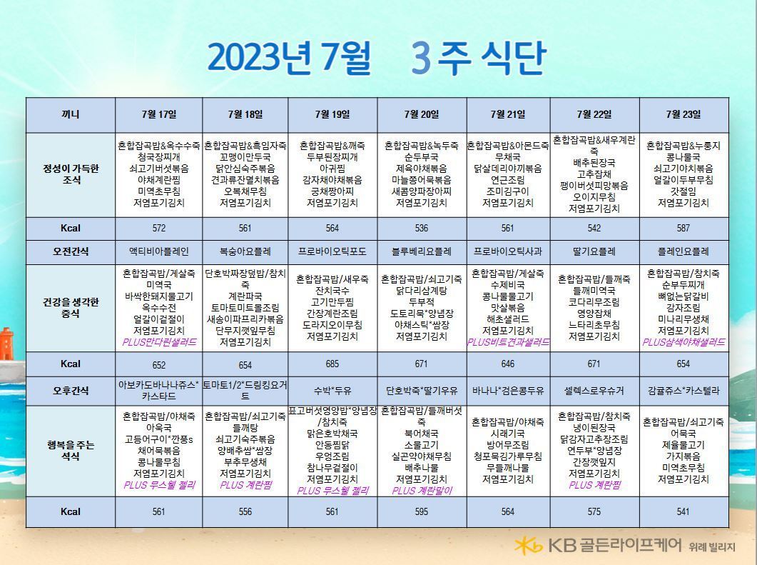 위례빌리지 [식단안내] 위례 빌리지 7월 3주차 식단표 페이지 정보 작성자 KB 골든라이프케어 댓글 0건 조회 2,333회 작성일 23-07-13 14:24 목록 본문 목록 이전글[식단안내] 위례 케어센터 7월 3주차 식단표 23.07.13 다음글[ 오늘의 식단 ] 2023년 7월13일 목요일 23.07.13
