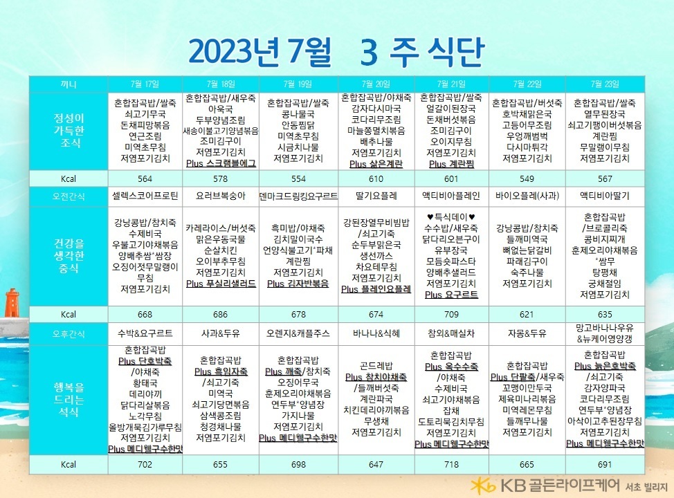 서초빌리지 [식단안내] 서초 빌리지 7월 3주차 식단표 페이지 정보 작성자 KB 골든라이프케어 댓글 0건 조회 2,360회 작성일 23-07-13 18:33 목록 본문 목록 이전글[오늘의 식단] 2023년 7월 18일 화요일 23.07.18 다음글[식단안내] 위례 케어센터 7월 3주차 식단표 23.07.13