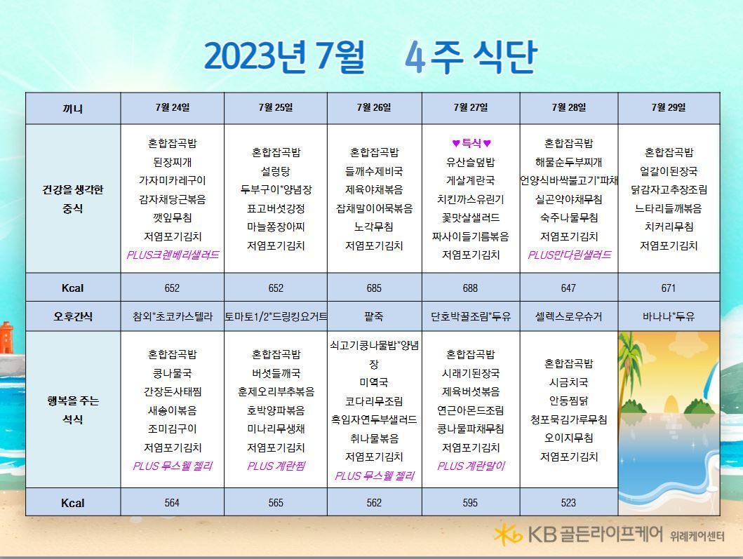 위례케어센터 [식단안내] 위례 케어센터 7월 4주차 식단표 페이지 정보 작성자 KB 골든라이프케어 댓글 0건 조회 2,440회 작성일 23-07-21 09:38 목록 본문 목록 이전글[식단안내] 서초 빌리지 7월 4주차 식단표 23.07.21 다음글[식단안내] 위례 빌리지 7월 4주차 식단표 23.07.21