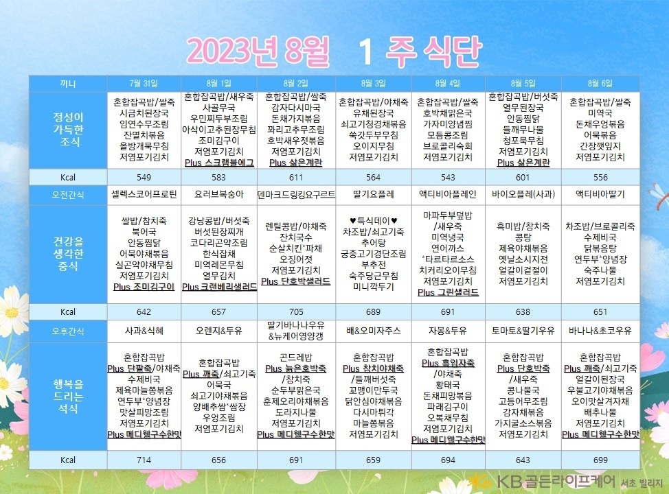 서초빌리지 [식단안내] 서초 빌리지 8월 1주차 식단표 페이지 정보 작성자 KB 골든라이프케어 댓글 0건 조회 2,339회 작성일 23-07-26 18:38 목록 본문 목록 이전글[식단안내] 위례 빌리지 8월 1주차 식단표 23.07.27 다음글[오늘의 식단] 2023년 7월 24일 월요일 23.07.24