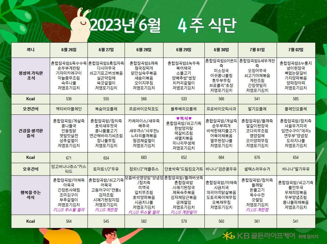 위례빌리지 [식단안내] 위례 빌리지 6월 4주차 식단표 페이지 정보 작성자 KB 골든라이프케어 댓글 0건 조회 2,306회 작성일 23-06-27 07:59 목록 본문 목록 이전글[식단안내] 위례 케어센터 6월 4주차 식단표 23.06.27 다음글[식단안내] 서초 빌리지 6월 4주차 식단표 23.06.23