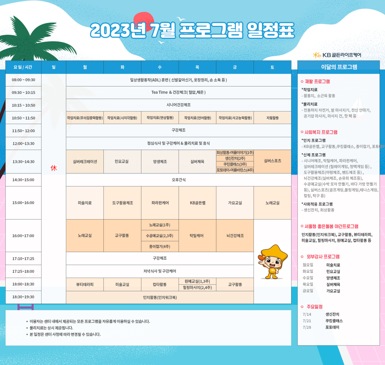 강동케어센터 [프로그램 안내] 2023년 강동케어센터 7월 프로그램 일정표 페이지 정보 작성자 KB 골든라이프케어 댓글 0건 조회 2,554회 작성일 23-06-29 10:43 목록 본문 목록 이전글[식단안내] 2023년 강동케어센터 7월 식단표 23.06.29 다음글[ 오늘의 식단 ] 2023년 6월 28일 수요일 23.06.29