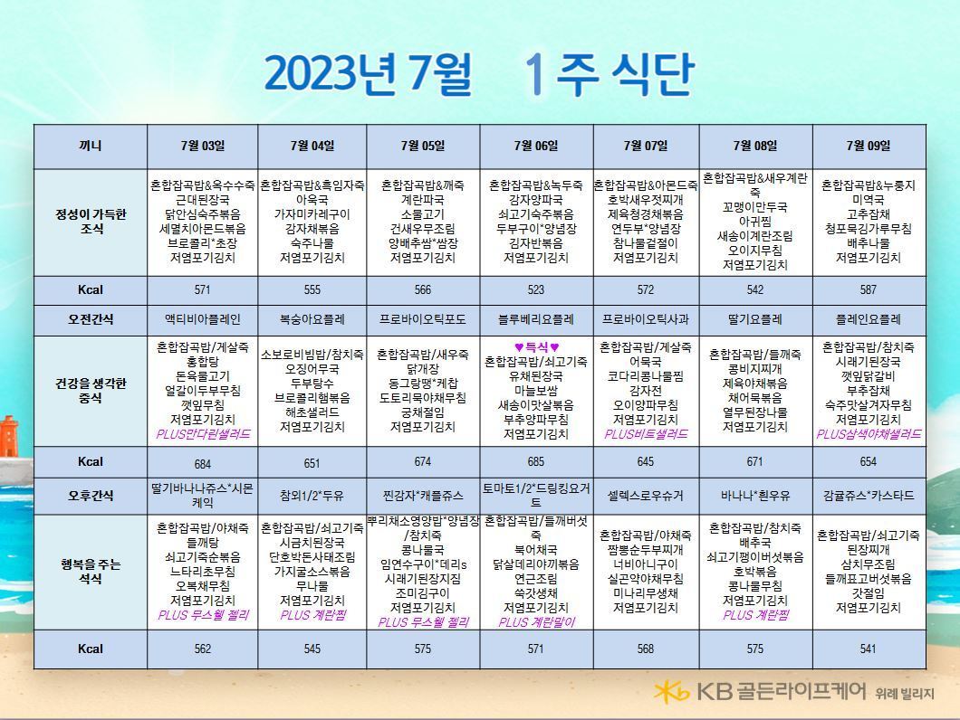 위례빌리지 [식단안내] 위례 빌리지 7월 1주차 식단표 페이지 정보 작성자 KB 골든라이프케어 댓글 0건 조회 2,361회 작성일 23-06-30 10:13 목록 본문 목록 이전글[식단안내] 위례 케어센터 7월 1주차 식단표 23.06.30 다음글[프로그램 안내] 2023년 위례케어센터 7월 프로그램 일정표 23.06.29