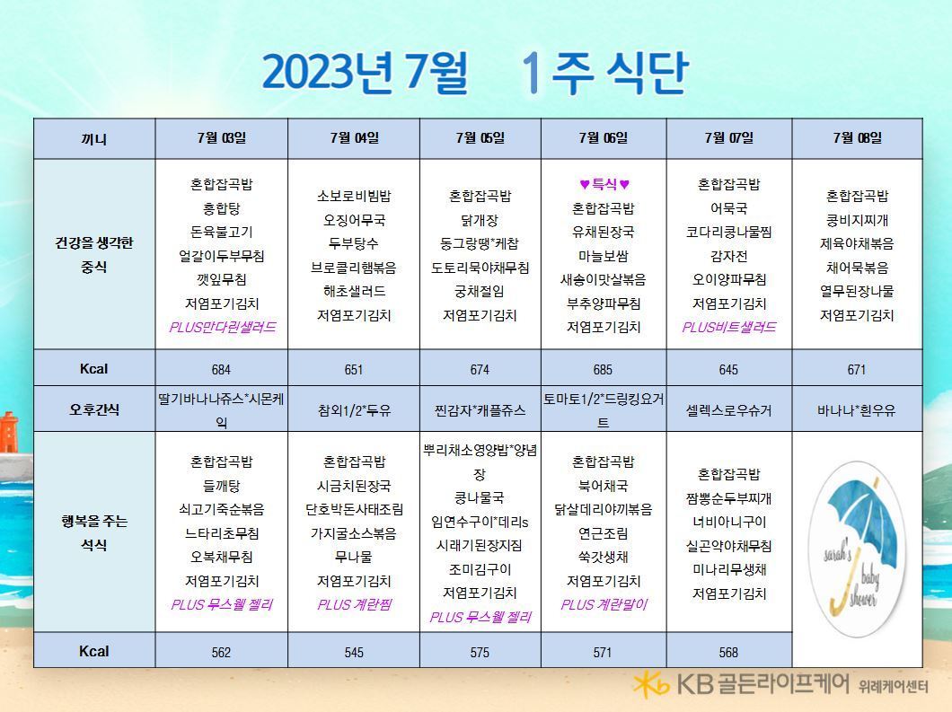 위례케어센터 [식단안내] 위례 케어센터 7월 1주차 식단표 페이지 정보 작성자 KB 골든라이프케어 댓글 0건 조회 2,431회 작성일 23-06-30 10:14 목록 본문 목록 이전글[ 오늘의 식단 ] 2023년 6월 30일 금요일 23.06.30 다음글[식단안내] 위례 빌리지 7월 1주차 식단표 23.06.30