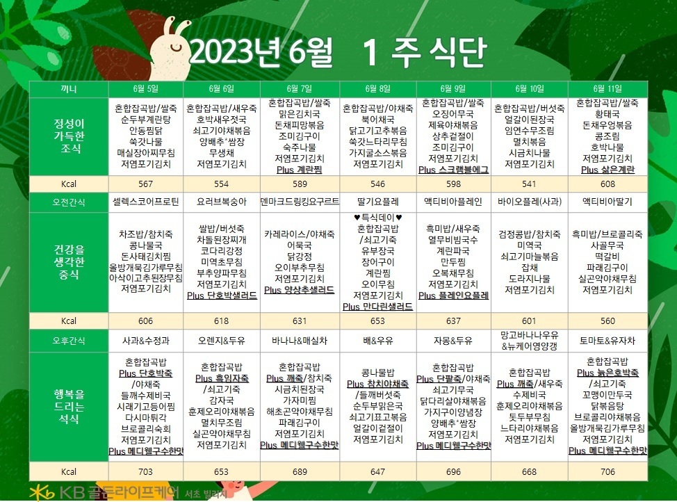 서초빌리지 [식단안내] 서초 빌리지 6월 1주차 식단표 페이지 정보 작성자 KB 골든라이프케어 댓글 0건 조회 2,364회 작성일 23-06-02 18:49 목록 본문 목록 이전글[ 오늘의 식단 ] 2023년 6월 5일 월요일 23.06.05 다음글[식단안내] 위례 케어센터 6월 1주차 식단표 23.06.02