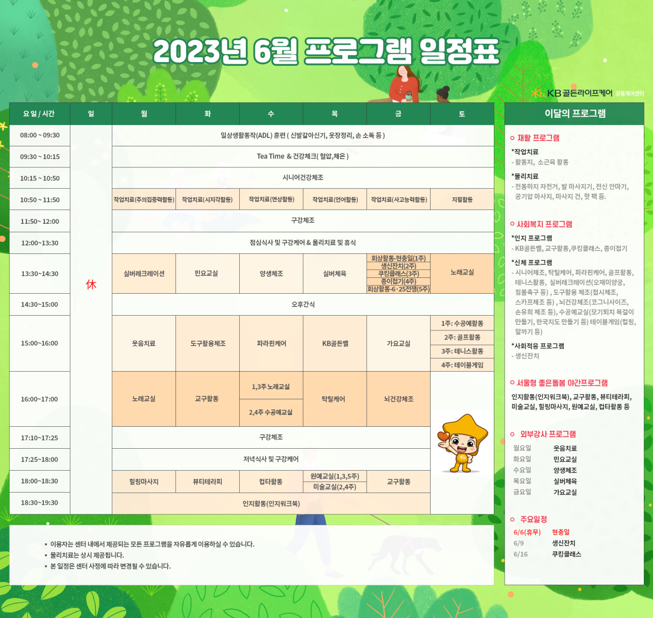 강동케어센터 [프로그램 안내] 2023년 강동케어센터 6월 프로그램 일정표 페이지 정보 작성자 KB 골든라이프케어 댓글 0건 조회 2,544회 작성일 23-05-31 14:51 목록 본문 목록 이전글[프로그램안내] 2023년 서초 빌리지 6월 프로그램 일정표 23.06.01 다음글[식단안내] 2023년 강동케어센터 6월 식단표 23.05.31