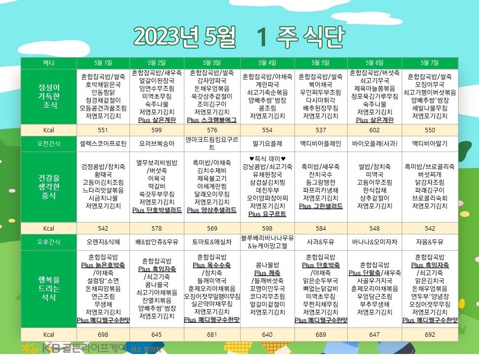 서초빌리지 [식단안내] 서초 빌리지 5월 1주차 식단표 페이지 정보 작성자 KB 골든라이프케어 댓글 0건 조회 2,284회 작성일 23-04-29 20:06 목록 본문 목록 이전글[식단안내] 위례 케어센터 5월 1주차 식단표 23.05.01 다음글[프로그램안내] 2023년 서초 빌리지 5월 프로그램 일정표 23.04.28