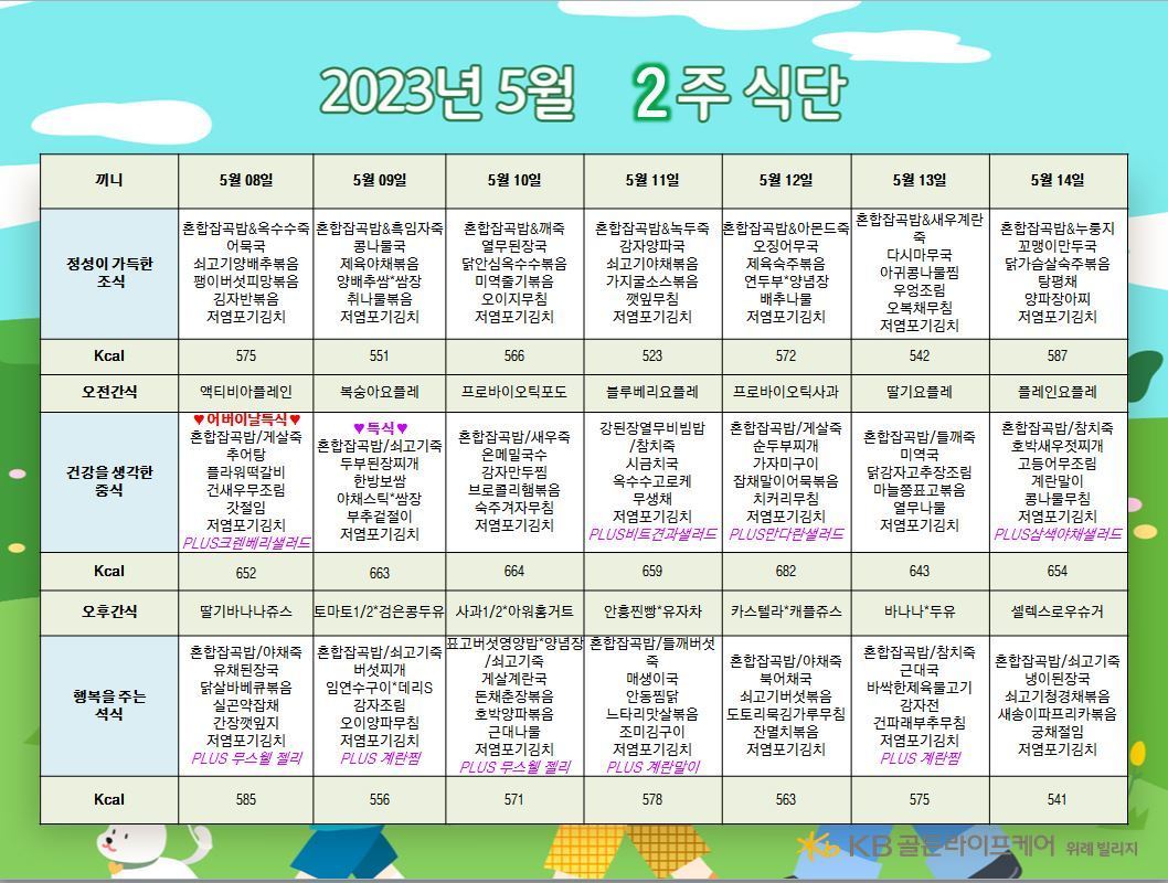 위례빌리지 [식단안내] 위례 빌리지 5월 2주차 식단표 페이지 정보 작성자 KB 골든라이프케어 댓글 0건 조회 2,278회 작성일 23-05-11 08:33 목록 본문 목록 이전글[식단안내] 서초 빌리지 5월 3주차 식단표 23.05.12 다음글[ 오늘의 식단 ] 2023년 5월 9일 목요일 23.05.09