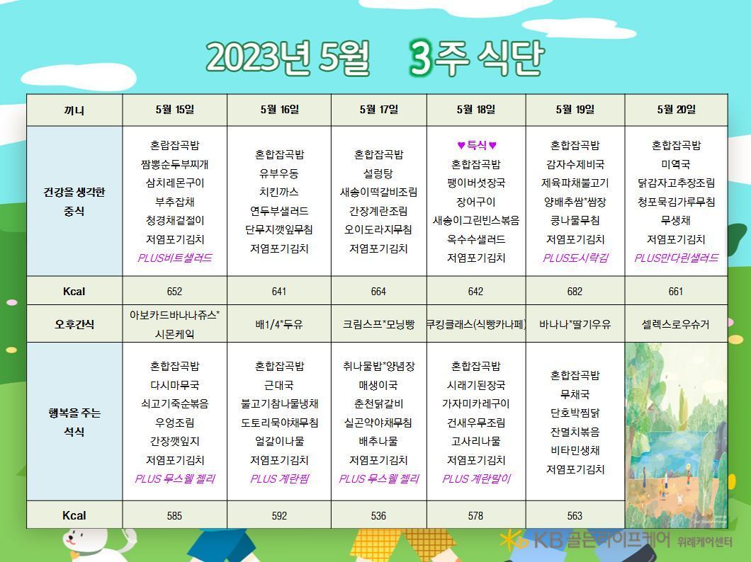 위례케어센터 [식단안내] 위례 케어센터 5월 3주차 식단표 페이지 정보 작성자 KB 골든라이프케어 댓글 0건 조회 2,379회 작성일 23-05-13 10:31 목록 본문 목록 이전글[ 오늘의 식단 ] 2023년 5월 13일 토요일 23.05.13 다음글[식단안내] 위례 빌리지 5월 3주차 식단표 23.05.13