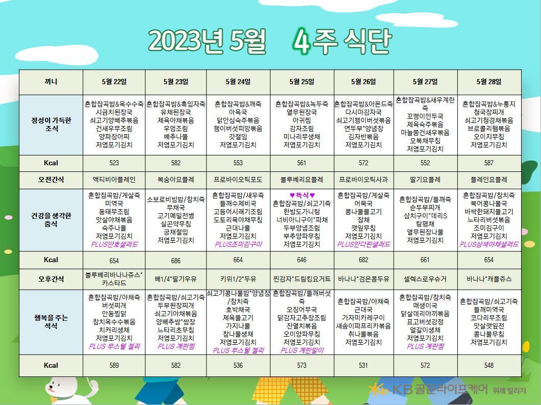 위례빌리지 [식단안내] 위례 빌리지 5월 4주차 식단표 페이지 정보 작성자 KB 골든라이프케어 댓글 0건 조회 2,428회 작성일 23-05-18 09:36 목록 본문 목록 이전글[식단안내] 위례 케어센터 5월 4주차 식단표 23.05.18 다음글[ 오늘의 식단 ] 2023년 5월 13일 토요일 23.05.13