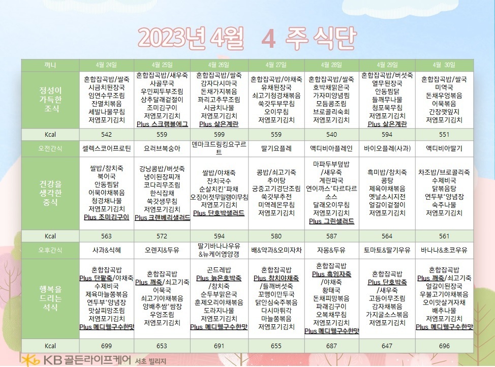 서초빌리지 [식단안내] 서초 빌리지 4월 4주차 식단표 페이지 정보 작성자 KB 골든라이프케어 댓글 0건 조회 2,311회 작성일 23-04-21 18:35 목록 본문 목록 이전글[식단안내] 위례 케어센터 4월 4주차 식단표 23.04.22 다음글[오늘의 식단] 2023년 4월 19일 수요일 23.04.19