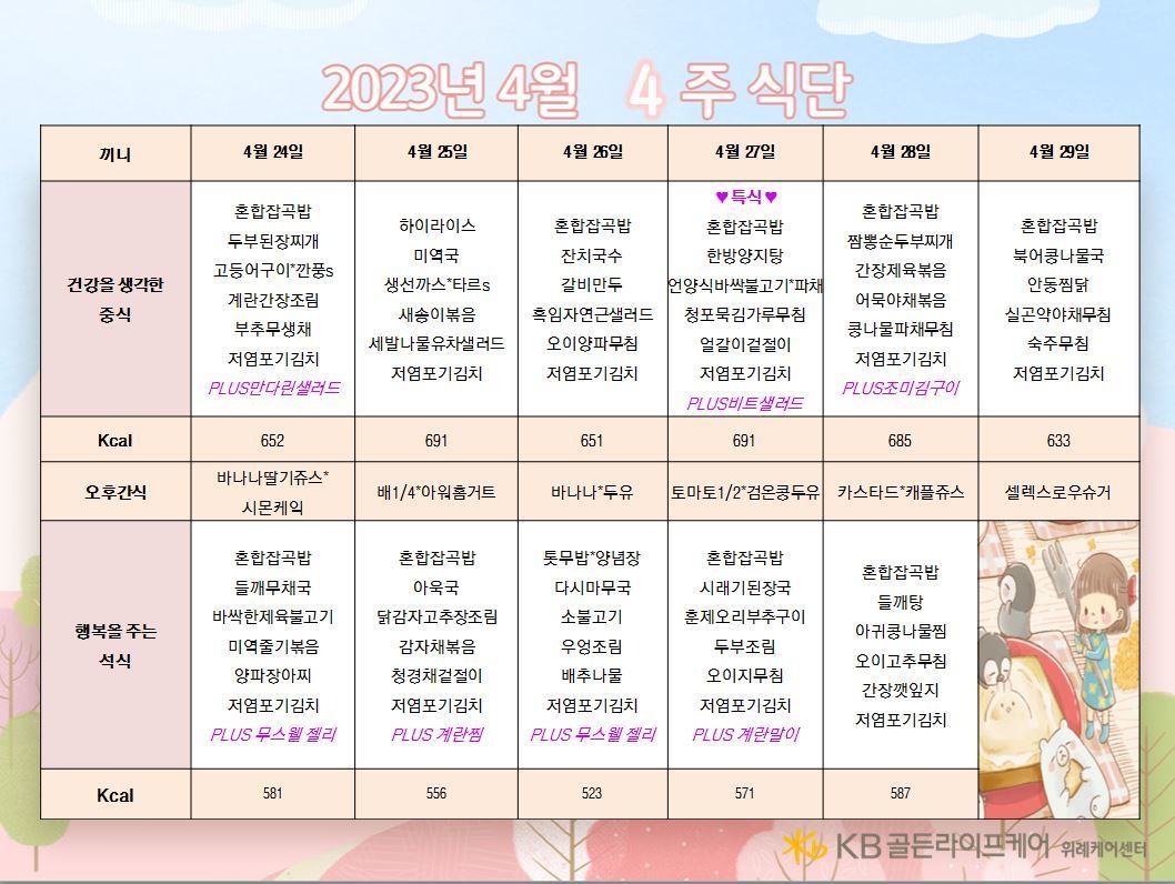 위례케어센터 [식단안내] 위례 케어센터 4월 4주차 식단 페이지 정보 작성자 KB 골든라이프케어 댓글 0건 조회 2,298회 작성일 23-04-24 08:33 목록 본문 목록 이전글[ 오늘의 식단 ] 2023년 4월 25일 화요일 23.04.25 다음글[식단안내] 위례 케어센터 4월 4주차 식단표 23.04.22