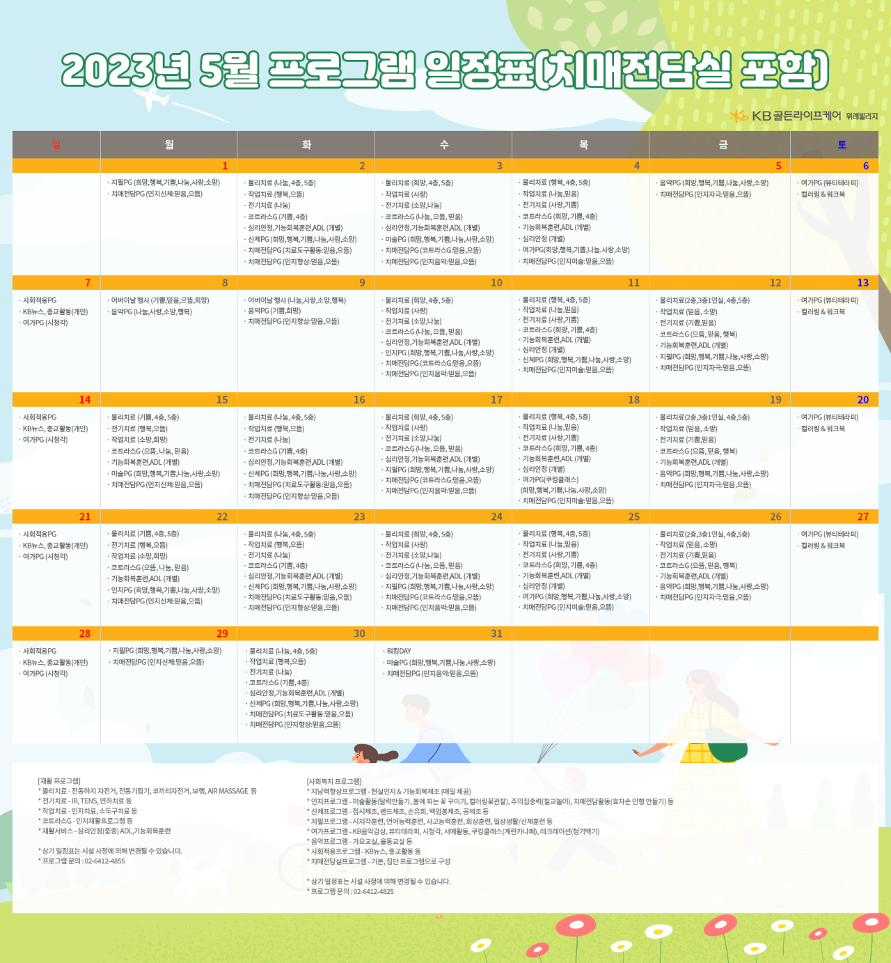 위례빌리지 [프로그램안내] 2023년 위례 빌리지 5월 프로그램 일정표 페이지 정보 작성자 KB 골든라이프케어 댓글 0건 조회 2,858회 작성일 23-04-25 17:50 목록 본문 목록 이전글[프로그램 안내] 2023년 위례케어센터 5월 프로그램 일정표 23.04.27 다음글[ 오늘의 식단 ] 2023년 4월 25일 화요일 23.04.25