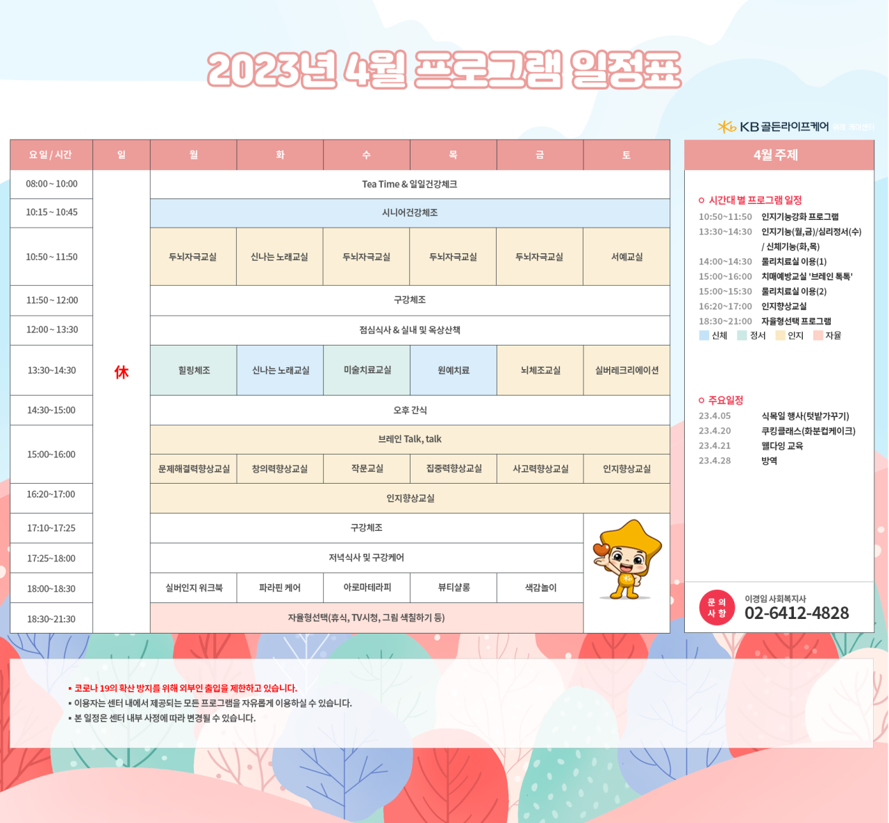 위례케어센터 [프로그램 안내] 2023년 위례케어센터 4월 프로그램 일정표 페이지 정보 작성자 KB 골든라이프케어 댓글 0건 조회 2,886회 작성일 23-03-29 09:58 목록 본문 목록 이전글[ 오늘의 식단 ] 2023년 3월 31일 금요일 23.03.31 다음글[ 오늘의 식단 ] 2023년 3월 28일 화요일 23.03.28