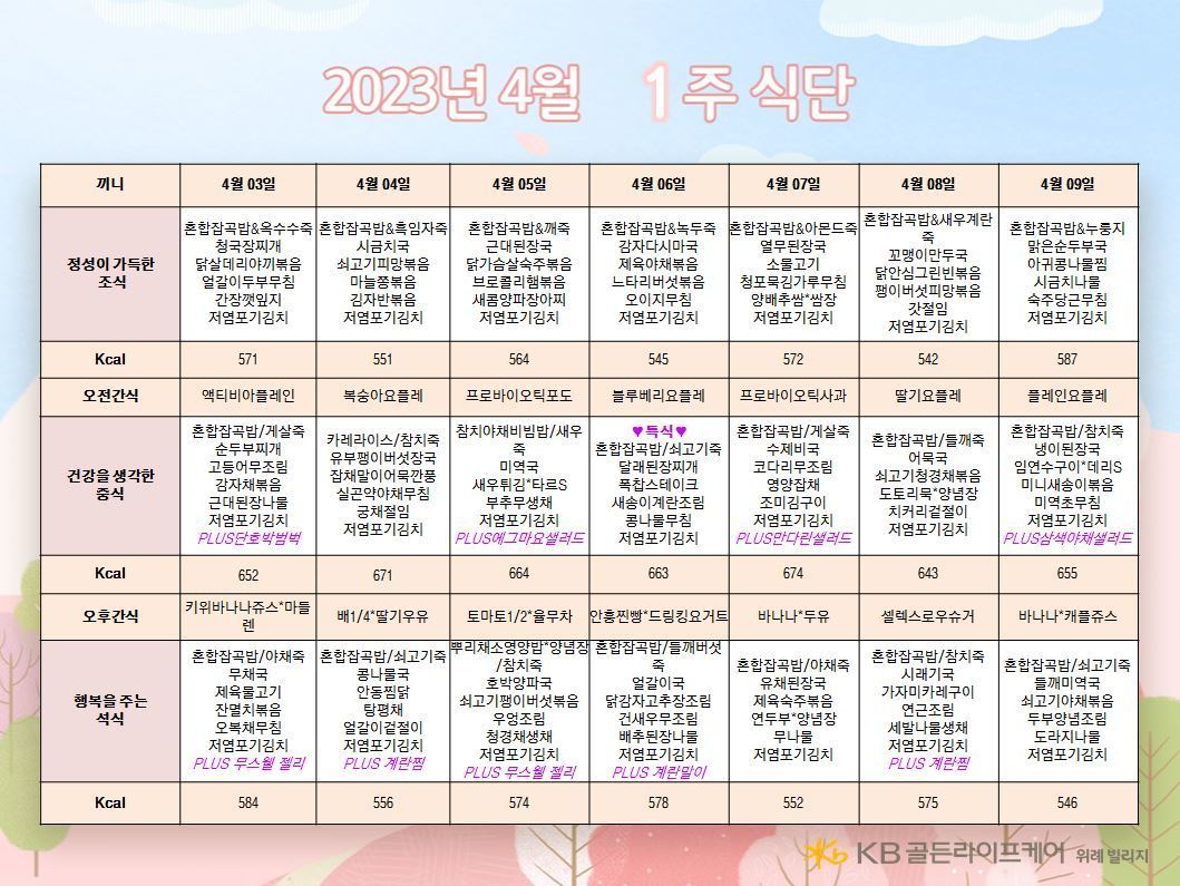 위례빌리지 [식단안내] 위례 빌리지 4월 1주차 식단표 페이지 정보 작성자 KB 골든라이프케어 댓글 0건 조회 2,481회 작성일 23-03-31 15:37 목록 본문 목록 이전글[식단안내] 위례 케어센터 4월 1주차 식단표 23.03.31 다음글[식단안내] 2023년 강동케어센터 4월 식단표 23.03.31