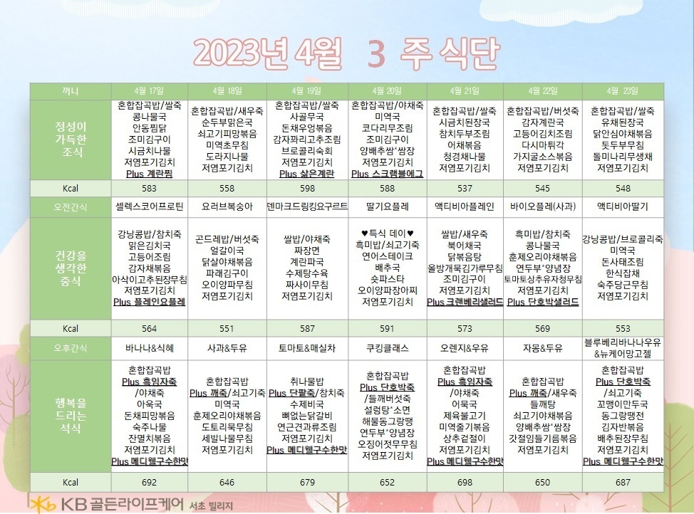 서초빌리지 [식단안내] 서초 빌리지 4월 3주차 식단표 페이지 정보 작성자 KB 골든라이프케어 댓글 0건 조회 2,367회 작성일 23-04-12 18:36 목록 본문 목록 이전글[프로그램안내] 2023년 서초 빌리지 4월 프로그램 일정표 23.04.13 다음글[ 오늘의 식단 ] 2023년 4월 11일 화요일 23.04.11