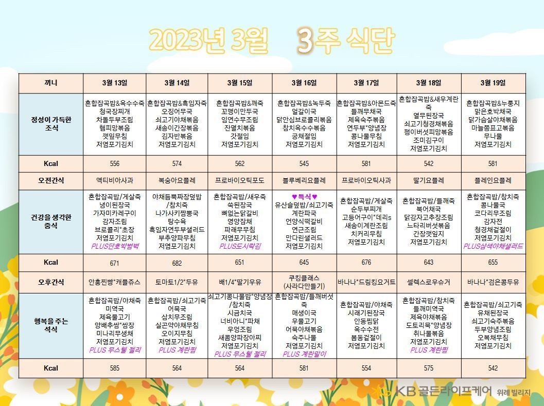 위례빌리지 [식단안내] 위례 빌리지 3월 3주차 식단표 페이지 정보 작성자 KB 골든라이프케어 댓글 0건 조회 2,494회 작성일 23-03-11 15:17 목록 본문 목록 이전글[식단안내] 위례 케어센터 3월 3주차 식단표 23.03.11 다음글[식단안내] 서초빌리지 3월 3주차 식단표 23.03.10