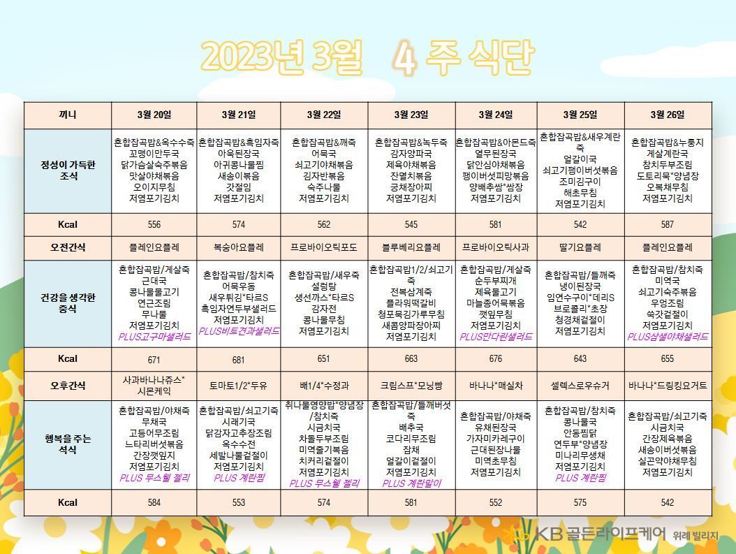 위례빌리지 [식단안내] 위례 빌리지 3월 4주차 식단표 페이지 정보 작성자 KB 골든라이프케어 댓글 0건 조회 2,488회 작성일 23-03-16 13:15 목록 본문 목록 이전글[식단안내] 위례 케어센터 3월 4주차 식단표 23.03.16 다음글[오늘의 식단] 2023년 3월 14일 화요일 23.03.14