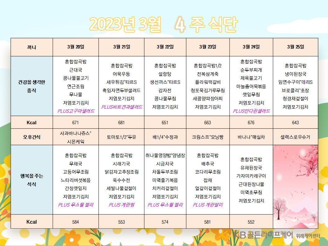 위례케어센터 [식단안내] 위례 케어센터 3월 4주차 식단표 페이지 정보 작성자 KB 골든라이프케어 댓글 0건 조회 2,466회 작성일 23-03-16 13:16 목록 본문 목록 이전글[ 오늘의 식단 ] 2023년 3월 17일 금요일 23.03.17 다음글[식단안내] 위례 빌리지 3월 4주차 식단표 23.03.16