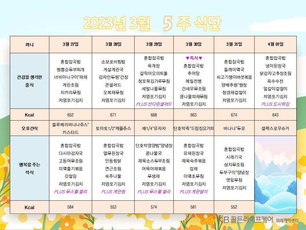 위례케어센터 [식단안내] 위례 케어센터 3월 5주차 식단표 페이지 정보 작성자 KB 골든라이프케어 댓글 0건 조회 2,436회 작성일 23-03-24 15:17 목록 본문 목록 이전글[ 오늘의 식단 ] 2023년 3월 24일 금요일 23.03.24 다음글[식단안내] 위례 빌리지 3월 5주차 식단표 23.03.24