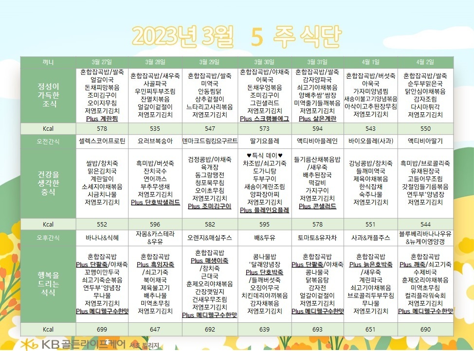서초빌리지 [식단안내] 서초 빌리지 3월 5주차 식단표 페이지 정보 작성자 KB 골든라이프케어 댓글 0건 조회 2,332회 작성일 23-03-25 18:09 목록 본문 목록 이전글[ 오늘의 식단 ] 2023년 3월 28일 화요일 23.03.28 다음글[ 오늘의 식단 ] 2023년 3월 24일 금요일 23.03.24