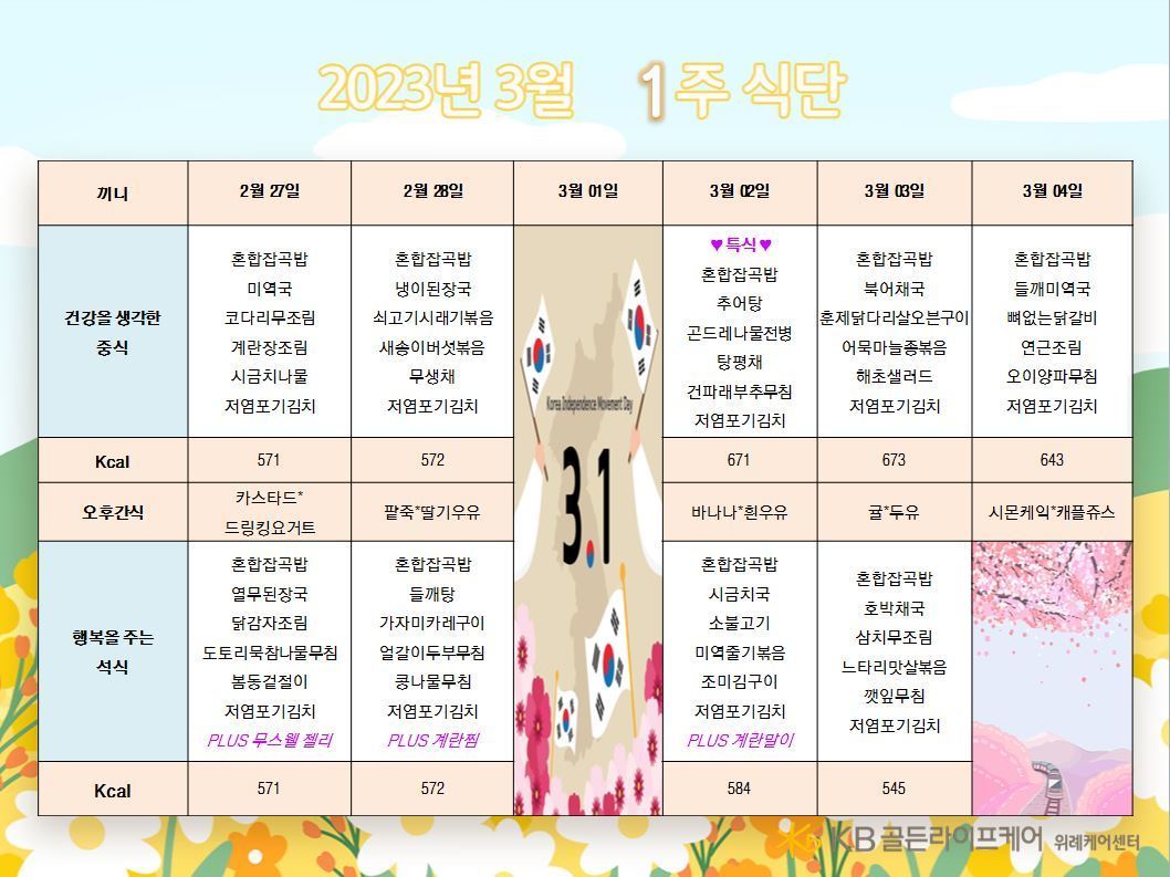 위례케어센터 [식단안내] 위례 케어센터 3월 1주차 식단표 페이지 정보 작성자 KB 골든라이프케어 댓글 0건 조회 2,391회 작성일 23-02-25 12:37 목록 본문 목록 이전글[프로그램 안내] 2023년 위례케어센터 3월 프로그램 23.02.28 다음글[식단안내] 위례 빌리지 3월 1주차 식단표 23.02.25