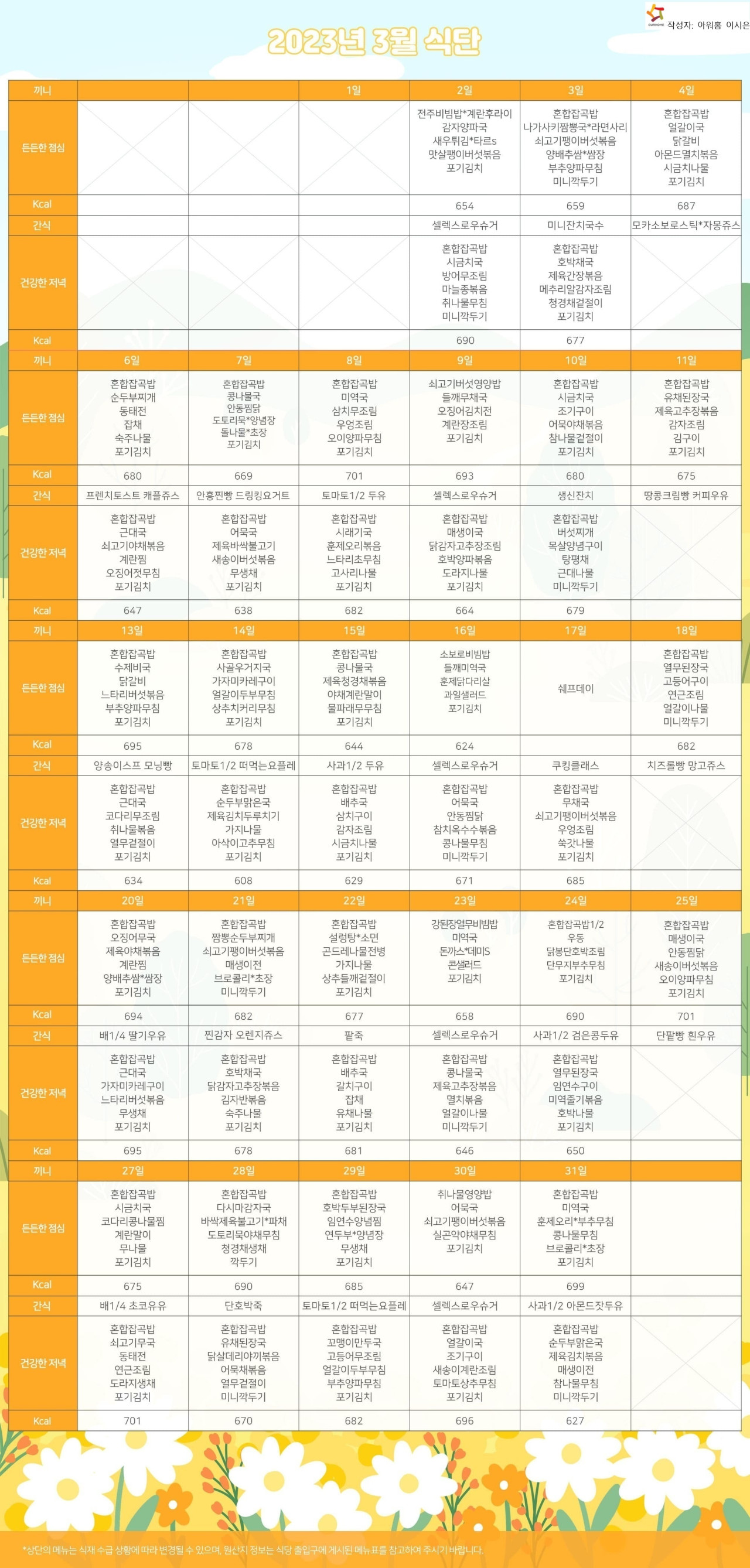 강동케어센터 [식단안내] 2023년 강동케어센터 3월 식단표 페이지 정보 작성자 KB 골든라이프케어 댓글 0건 조회 3,090회 작성일 23-02-28 17:54 목록 본문 목록 이전글[ 오늘의 식단 ] 2023년 3월2일 목요일 23.03.02 다음글[프로그램 안내] 2023년 강동케어센터 3월 프로그램 일정표 23.02.28