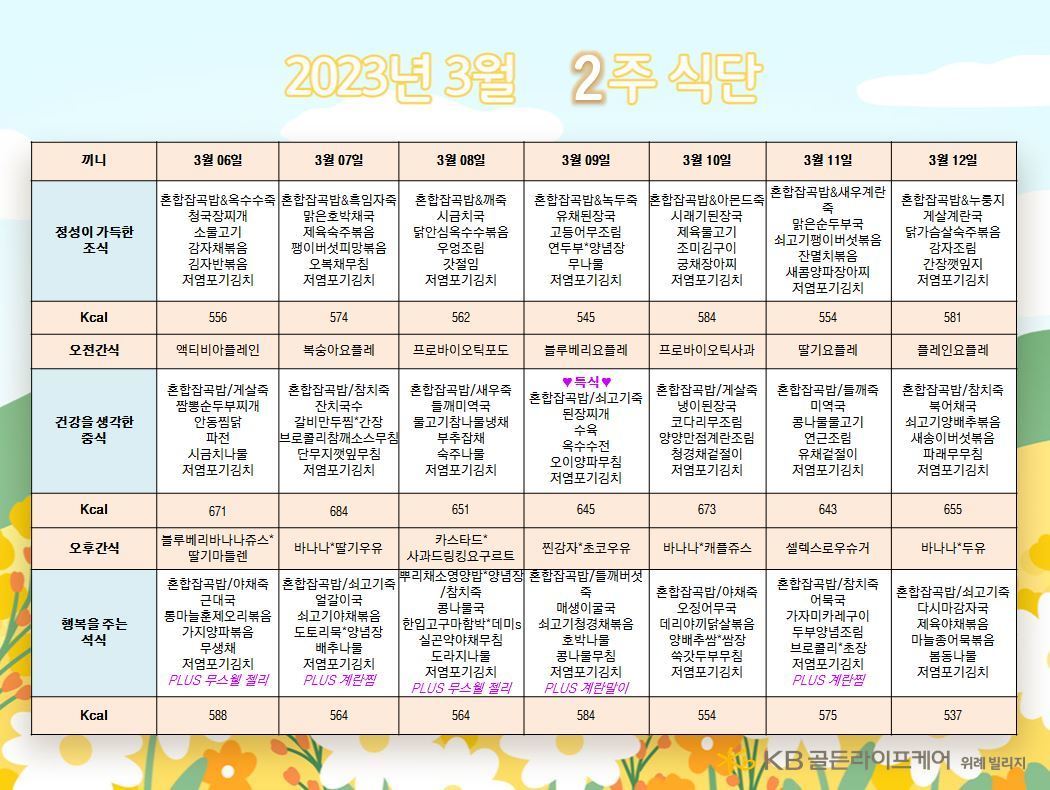 위례빌리지 [식단안내] 위례 빌리지 3월 2주차 식단표 페이지 정보 작성자 KB 골든라이프케어 댓글 0건 조회 2,513회 작성일 23-03-03 13:02 목록 본문 목록 이전글[식단안내] 위례 케어센터 3월 2주차 식단표 23.03.03 다음글[ 오늘의 식단 ] 2023년 3월2일 목요일 23.03.02