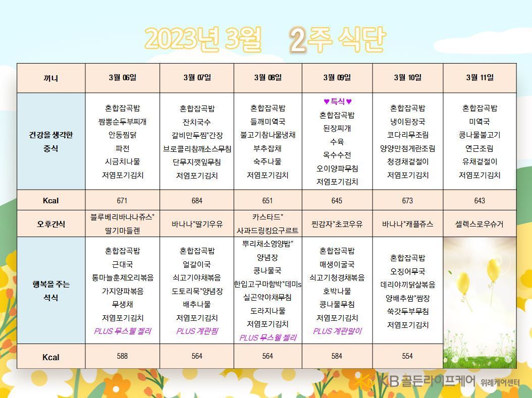 위례케어센터 [식단안내] 위례 케어센터 3월 2주차 식단표 페이지 정보 작성자 KB 골든라이프케어 댓글 0건 조회 2,423회 작성일 23-03-03 13:02 목록 본문 목록 이전글[식단안내] 서초빌리지 3월 2주차 식단표 23.03.05 다음글[식단안내] 위례 빌리지 3월 2주차 식단표 23.03.03