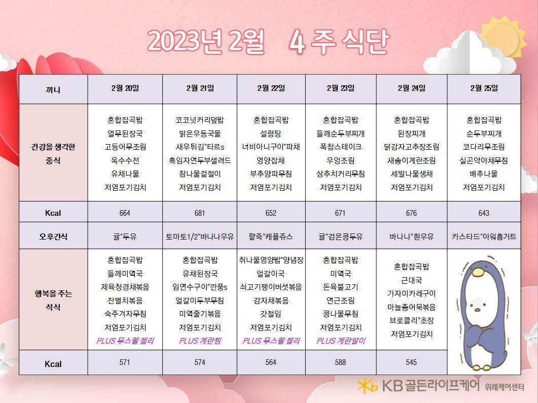 위례케어센터 [식단안내] 위례 케어센터 2월 4주차 식단표 페이지 정보 작성자 KB 골든라이프케어 댓글 0건 조회 2,438회 작성일 23-02-16 14:58 목록 본문 목록 이전글[식단안내] 위례 빌리지 2월 4주차 식단표 23.02.16 다음글[ 오늘의 식단 ] 2023년 2월 16일 목요일 23.02.16