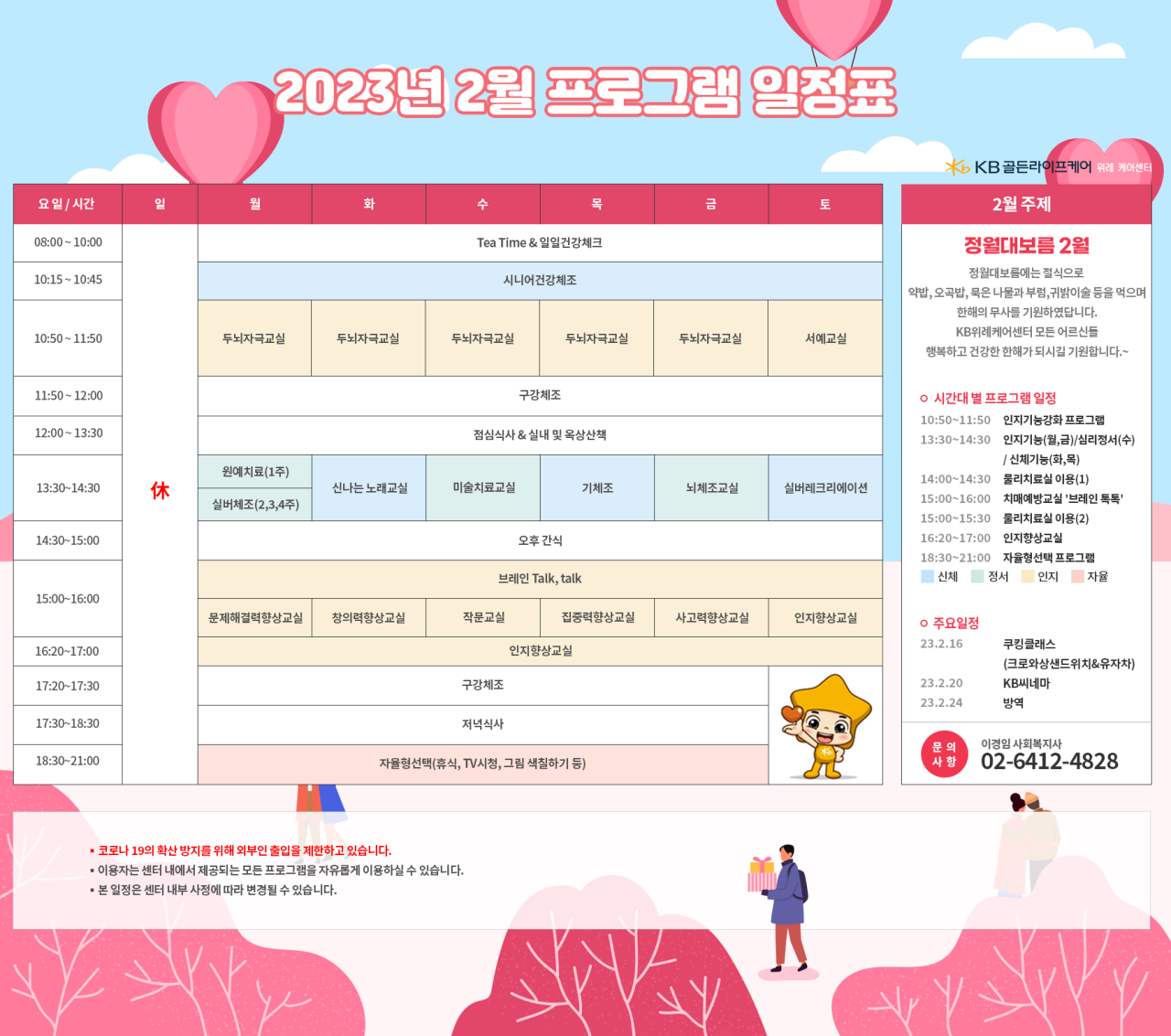 위례케어센터 [프로그램 안내] 2023년 위례케어센터 2월 프로그램 일정표 페이지 정보 작성자 KB 골든라이프케어 댓글 0건 조회 3,378회 작성일 23-01-31 17:21 목록 본문 목록 이전글[ 오늘의 식단 ] 2023년 1월 31일 화요일 23.01.31 다음글[식단안내] 2023년 강동케어센터 2월 식단표 23.01.31