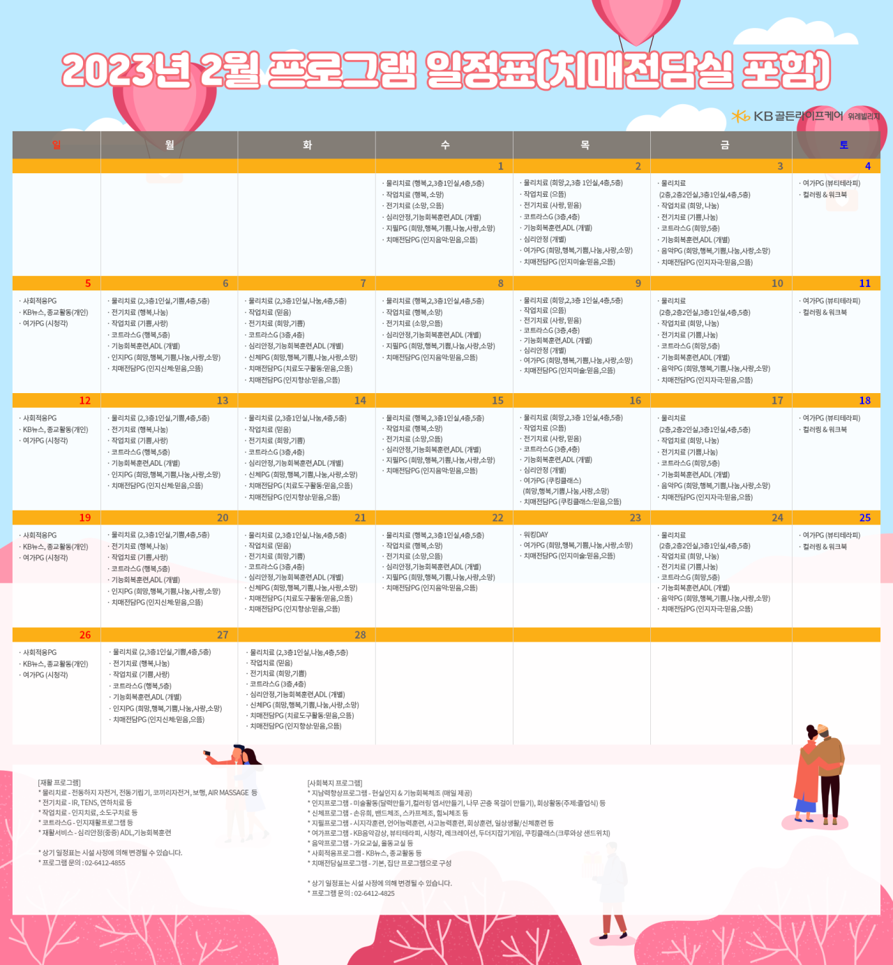 위례빌리지 [프로그램안내] 2023년 위례 빌리지 2월 프로그램 일정표 페이지 정보 작성자 KB 골든라이프케어 댓글 0건 조회 2,961회 작성일 23-02-01 09:46 목록 본문 목록 이전글[식단안내] 위례 빌리지 2월 2주차 식단표 23.02.02 다음글[ 오늘의 식단 ] 2023년 1월 31일 화요일 23.01.31