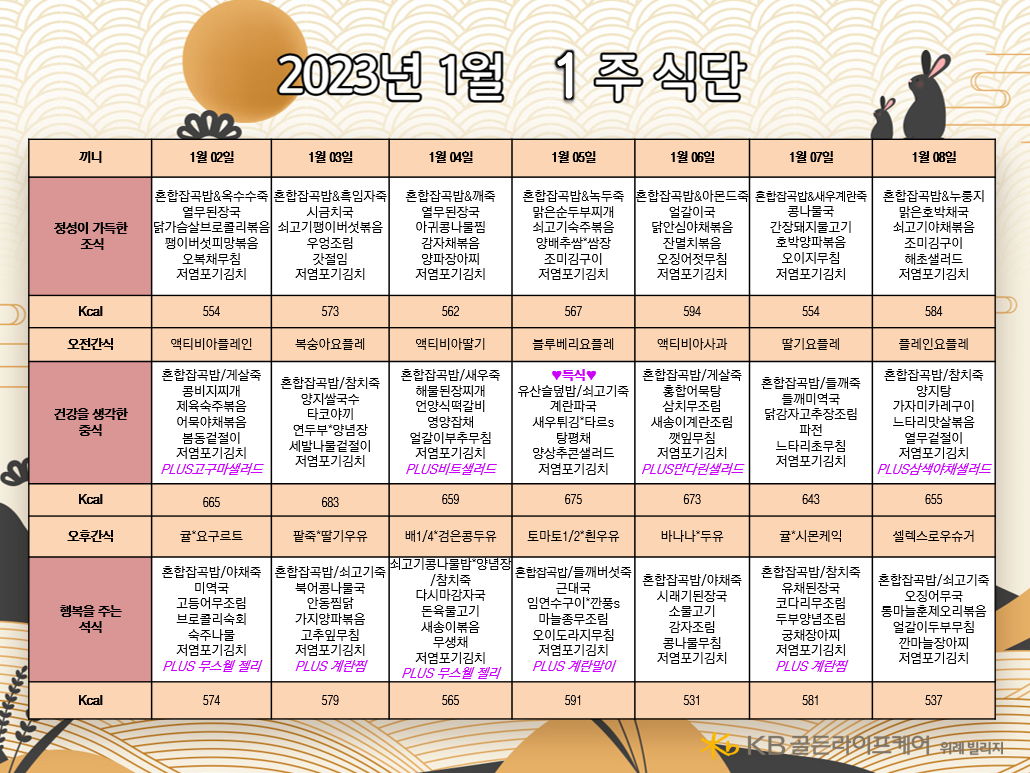 위례빌리지 [식단안내] 위례 빌리지 1월 1주차 식단표 페이지 정보 작성자 KB 골든라이프케어 댓글 0건 조회 2,528회 작성일 22-12-30 10:25 목록 본문 목록 이전글[식단안내] 위례 케어센터 1월 1주차 식단표 22.12.30 다음글[식단안내] 서초 빌리지 1월 1주차 식단표 22.12.29
