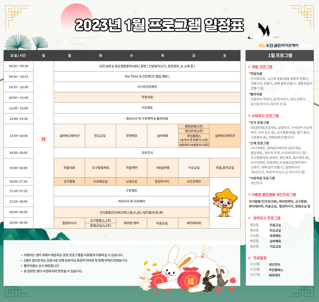 강동케어센터 [프로그램안내] 2023년 강동케어센터 1월 프로그램 일정표 페이지 정보 작성자 KB 골든라이프케어 댓글 0건 조회 2,788회 작성일 22-12-30 11:56 목록 본문 목록 이전글[식단안내] 2023년 강동케어센터 1월 식단표 22.12.30 다음글[식단안내] 위례 케어센터 1월 1주차 식단표 22.12.30