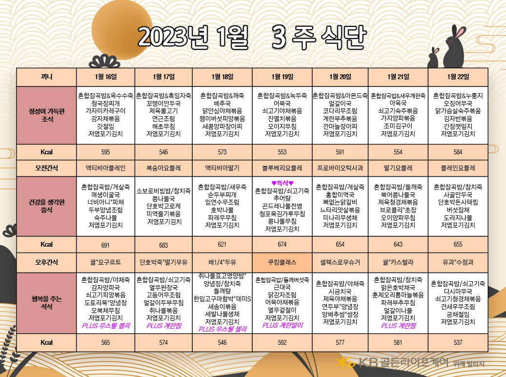 위례빌리지 [식단안내] 위례 빌리지 1월 3주차 식단표 페이지 정보 작성자 KB 골든라이프케어 댓글 0건 조회 2,448회 작성일 23-01-13 15:43 목록 본문 목록 이전글[식단안내] 위례 케어센터 1월 3주차 식단표 23.01.13 다음글[식단안내] 서초 빌리지 1월 3주차 식단표 23.01.13