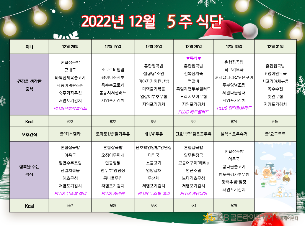 위례케어센터 [식단안내] 위례 케어센터 12월 5주차 식단표 페이지 정보 작성자 KB 골든라이프케어 댓글 0건 조회 2,463회 작성일 22-12-23 09:38 목록 본문 목록 이전글[오늘의 식단] 2022년 12월 23일 금요일 22.12.23 다음글[식단안내] 위례 빌리지 12월 5주차 식단표 22.12.23