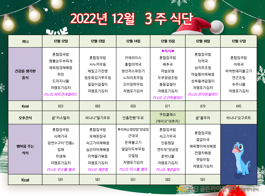 위례케어센터 [식단안내] 위례 케어센터 12월 3주차 식단표 페이지 정보 작성자 KB 골든라이프케어 댓글 0건 조회 2,531회 작성일 22-12-09 12:30 목록 본문 목록 이전글[식단안내] 서초 빌리지 12월 3주차 식단표 22.12.09 다음글[식단안내] 위례 빌리지 12월 3주차 식단표 22.12.09