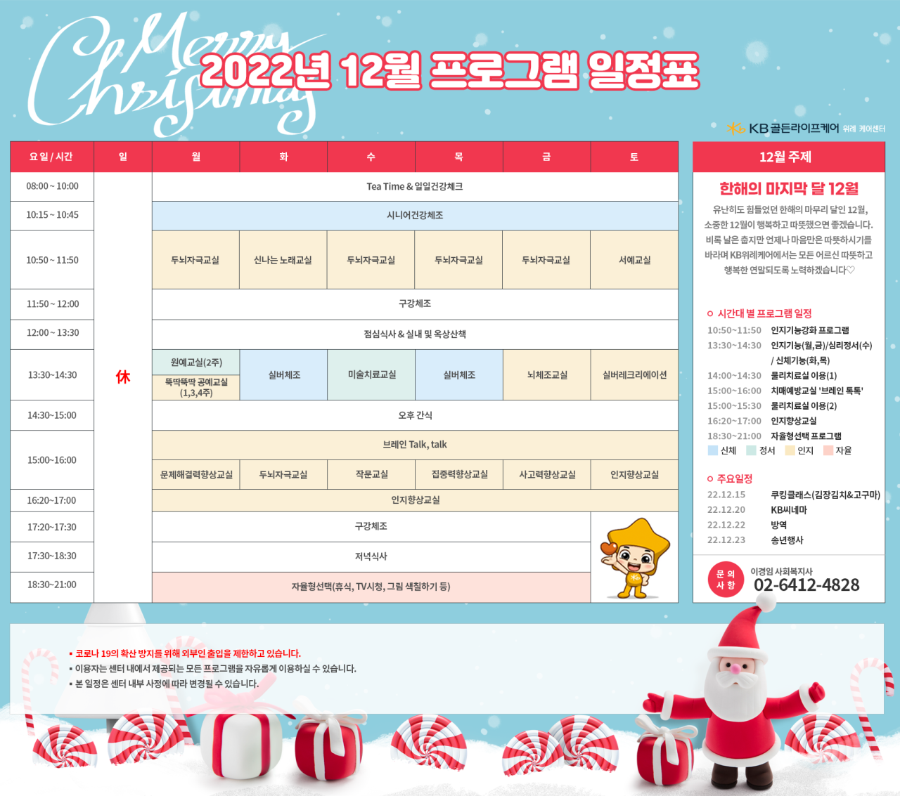 위례케어센터 [프로그램 안내] 2022년 위례케어센터 12월 프로그램 일정표 페이지 정보 작성자 KB 골든라이프케어 댓글 0건 조회 2,929회 작성일 22-11-29 12:59 목록 본문 목록 이전글[오늘의 식단] 2022년 11월 30일 수요일 22.11.30 다음글[오늘의 식단] 2022년 11월 29일 화요일 22.11.29