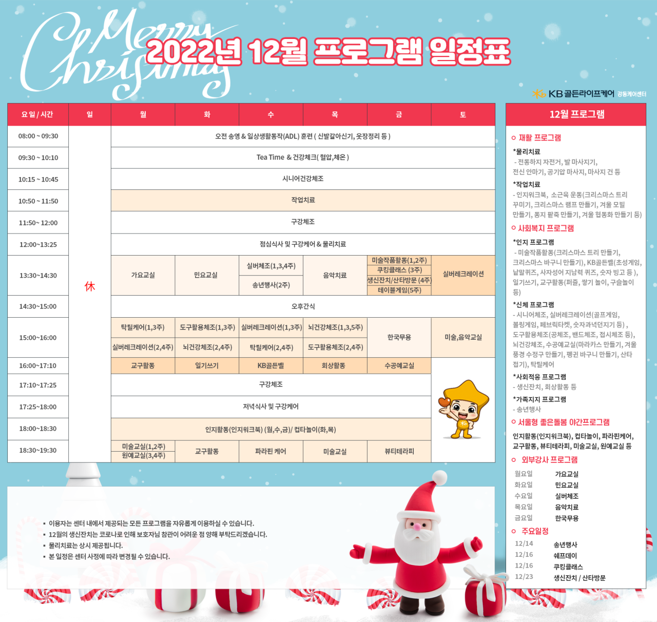 강동케어센터 [프로그램안내] 2022년 강동케어센터 12월 프로그램 일정표 페이지 정보 작성자 KB 골든라이프케어 댓글 0건 조회 2,973회 작성일 22-12-01 09:34 목록 본문 목록 이전글[ 오늘의 식단 ] 2022년 12월 1일 목요일 22.12.01 다음글[오늘의 식단] 2022년 11월 30일 수요일 22.11.30