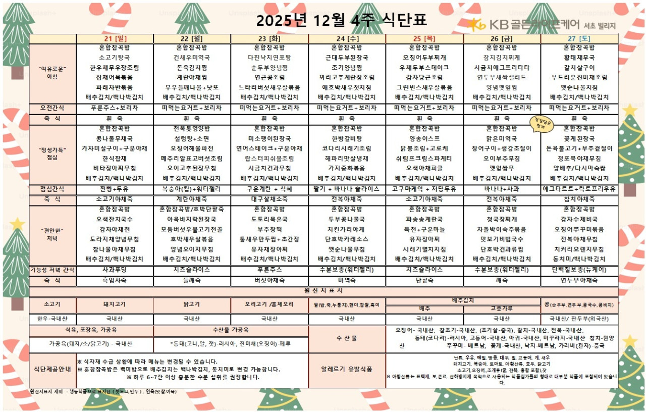 서초빌리지 [식단안내] 2025년 12월 4주차 식단안내