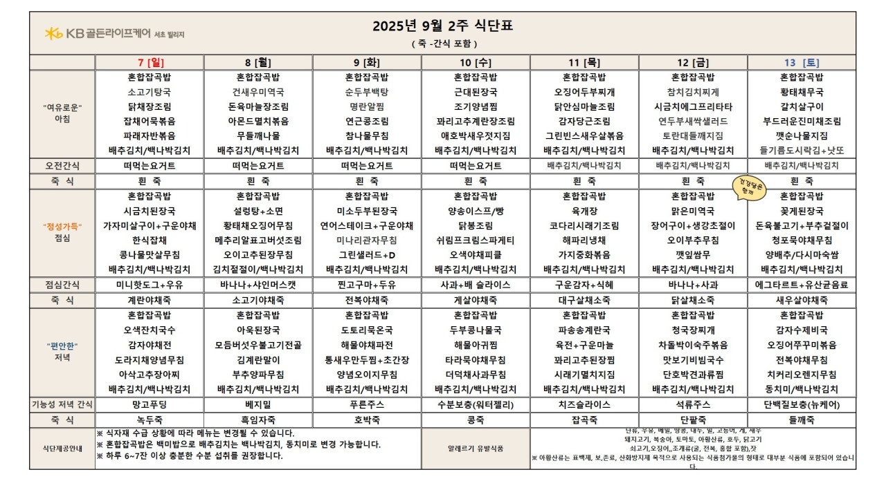 서초빌리지 서초 빌리지 2025년 9월 2주차 식단표