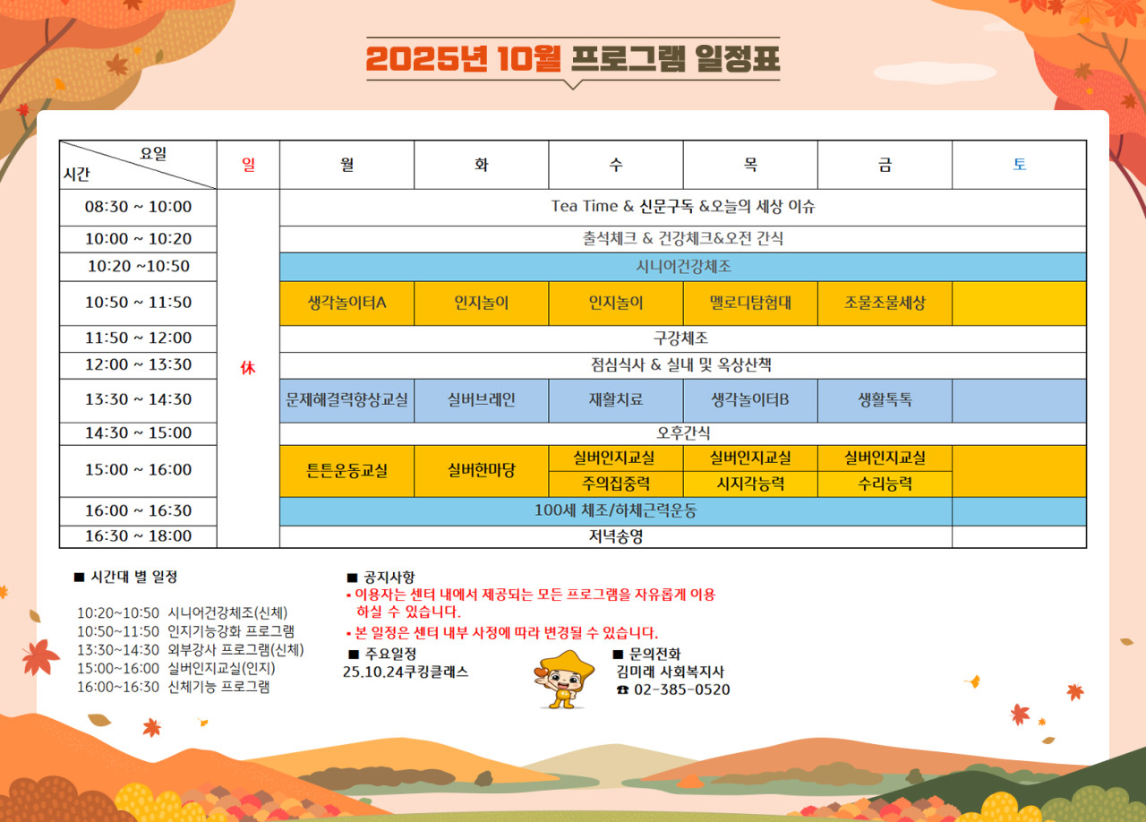 은평케어센터 [프로그램 안내] 2025년 은평 케어센터 10월 프로그램 일정표 페이지 정보 작성자 최고관리자 댓글 0건 조회 4,443회 작성일 25-10-02 17:19 목록 본문 목록 이전글[하루의식단]2025년 10월 1일 25.10.03 다음글[식단안내] 2025년 10월 2주차 식단표 25.10.02