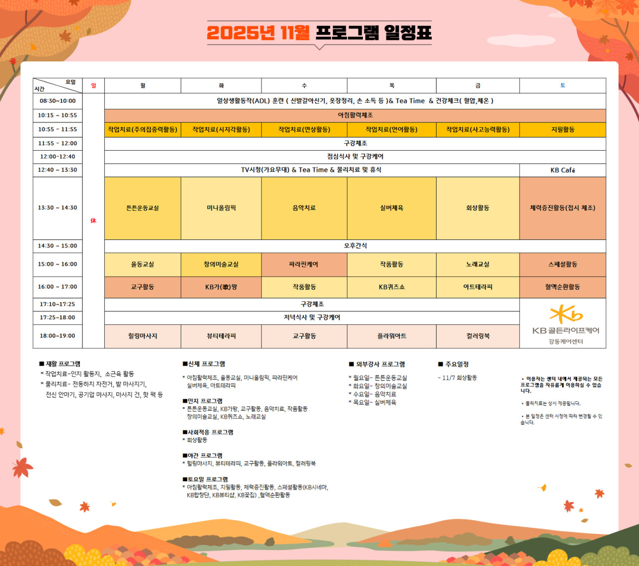 강동케어센터 [프로그램 안내] 2025년 강동케어센터 11월 프로그램 일정표 페이지 정보 작성자 최고관리자 댓글 0건 조회 2,081회 작성일 25-10-29 10:42 목록 본문 목록 이전글[프로그램 안내] 2025년 광교 빌리지 11월 프로그램 일정표 25.10.29 다음글[프로그램 안내]2025년 은평빌리지 11월 프로그램 일정표 25.10.28