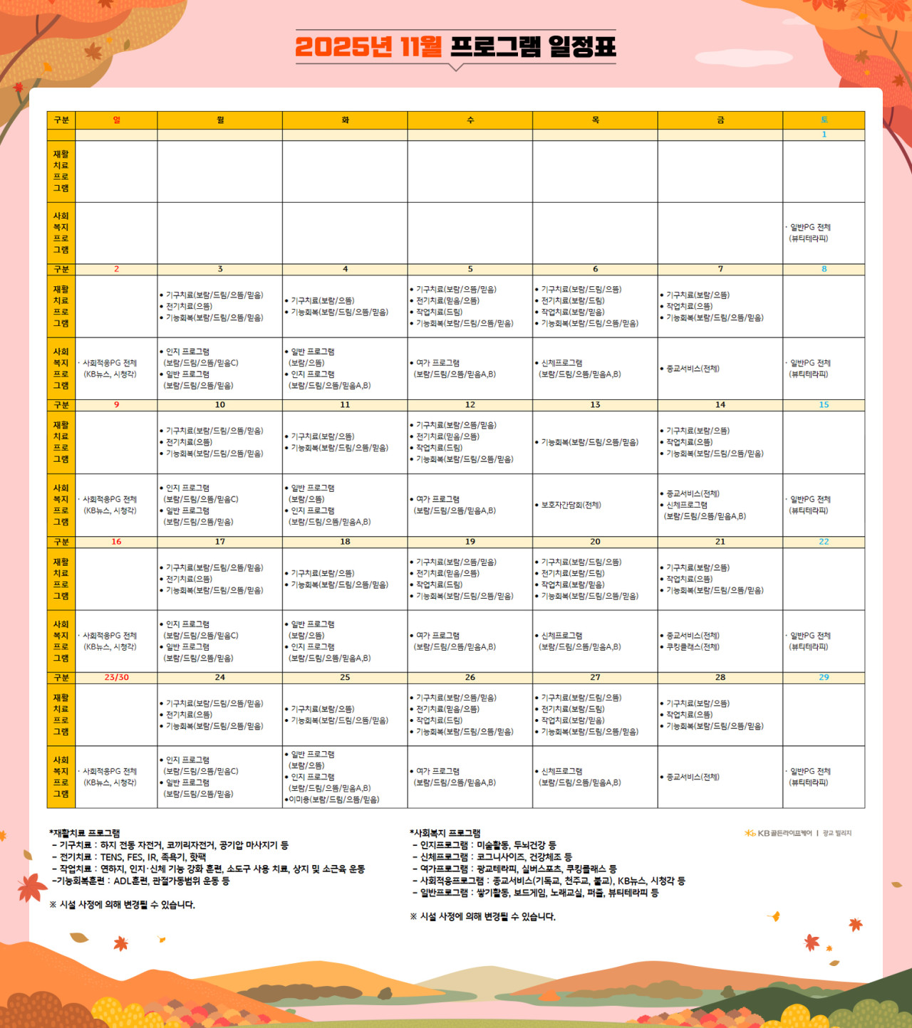 광교빌리지 [프로그램 안내] 2025년 광교 빌리지 11월 프로그램 일정표 페이지 정보 작성자 최고관리자 댓글 0건 조회 2,275회 작성일 25-10-29 11:47 목록 본문 목록 이전글[프로그램 안내] 2025년 위례케어센터 11월 프로그램 일정표 25.10.30 다음글[프로그램 안내] 2025년 강동케어센터 11월 프로그램 일정표 25.10.29