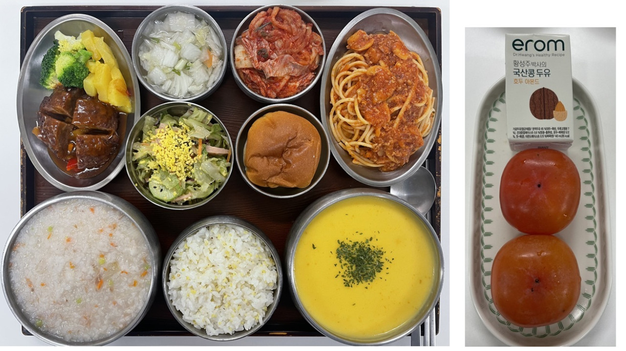 은평케어센터 [오늘의식단] 2025년 10월 29일 페이지 정보 작성자 최고관리자 댓글 0건 조회 1,462회 작성일 25-11-01 13:02 목록 본문 중식 : 기장밥/참치야채죽, 단호박크림스프/모닝빵, 떡갈비파인찹스테이크, 토마토스파게티, 맥시칸샐러드, 포기김치/나박김치, 플레인요플레 (오전간식)오후 간식 : 두유/씨없는 홍시 목록 이전글[식단안내] 2025년 11월 1째주 25.11.01 다음글{하루의식단] 2025년 10월 31일 25.11.01