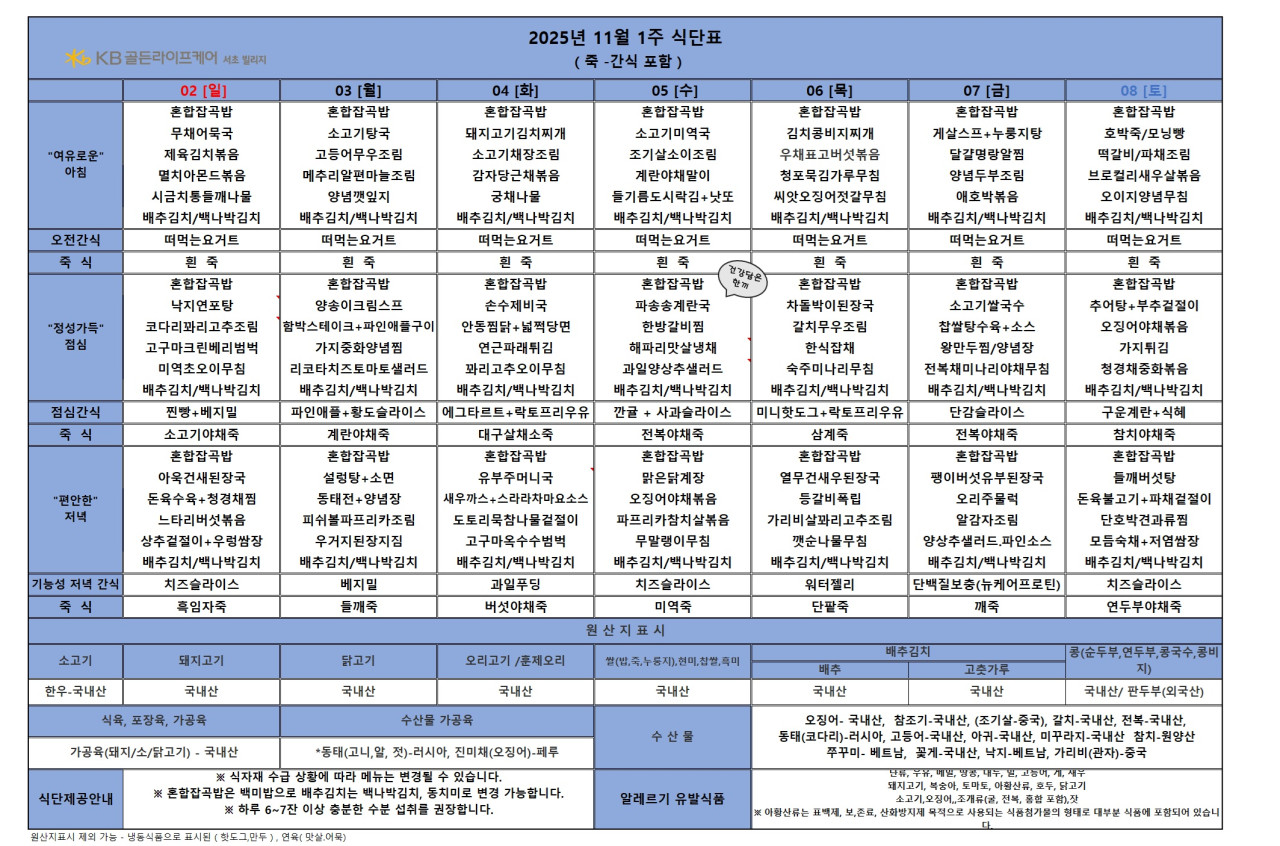 서초빌리지 서초빌리지 2025년 11월 1주차 식단안내
