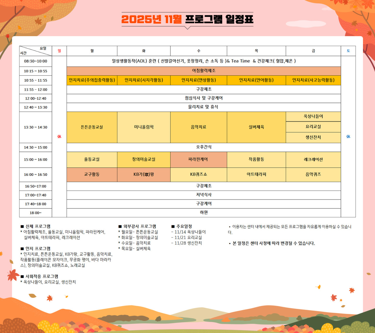 강동케어센터 [프로그램 안내] 2025년 강동케어센터 11월 프로그램 일정표 페이지 정보 작성자 최고관리자 댓글 0건 조회 1,973회 작성일 25-11-11 08:50 목록 본문 목록 이전글[식단안내] 2025년 11월 3주차 식단표 25.11.14 다음글[ 식단안내 ] 2025년 11월 2 주차 식단표 25.11.10