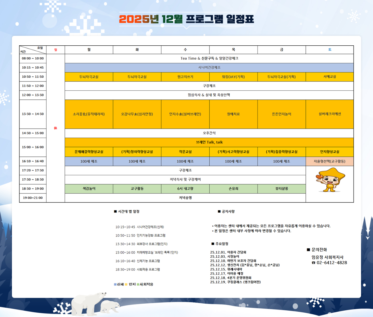 위례케어센터 [프로그램 안내] 2025년 위례케어센터 12월 프로그램 일정표 페이지 정보 작성자 최고관리자 댓글 0건 조회 1,464회 작성일 25-11-28 18:49 목록 본문 * 시설 내부 사정상 12/1(월) 시장놀이와 12/3(수) 이용자 간담회로 변경되었습니다. 이용에 참고 부탁드립니다~^^ 목록 이전글[식단안내] 2025년 12월 1주차 주간식단표 25.11.29 다음글[프로그램 안내]2025년 은평케어센터 12월 프로그램 일정표 25.11.28