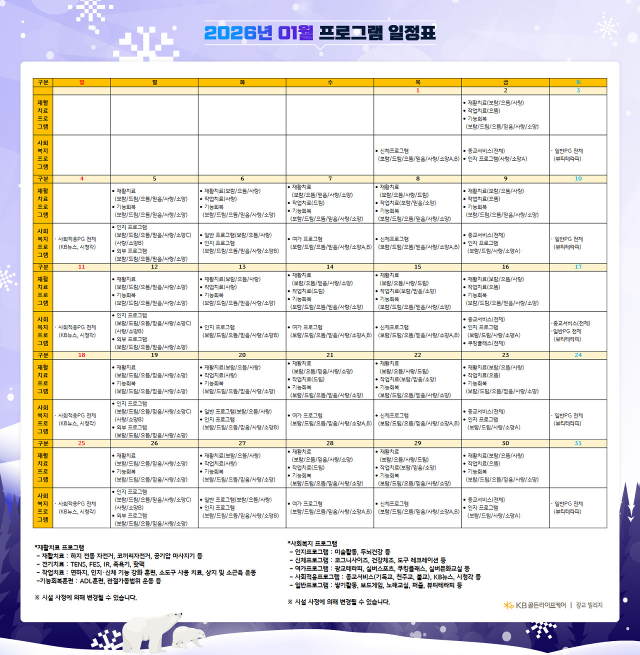 광교빌리지 [프로그램 안내] 2026년 광교 빌리지 1월 프로그램 일정표 페이지 정보 작성자 최고관리자 댓글 0건 조회 805회 작성일 25-12-30 10:28 목록 본문 목록 이전글[식단안내] 2025년 12월 5주 식단표 25.12.30 다음글[식단안내] 2025년 12월 5주 식단표 25.12.30